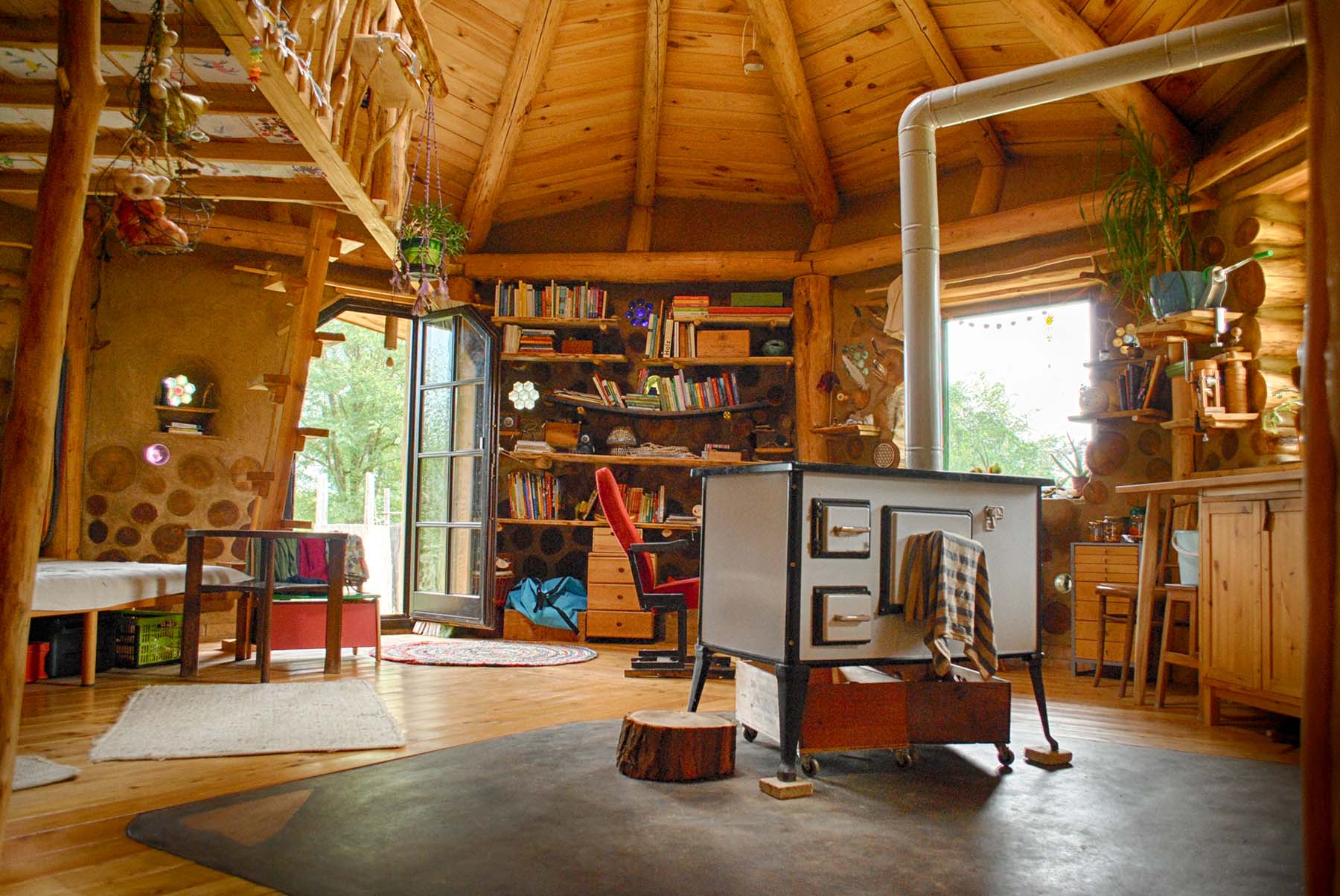 Eckdaten: 35 m² Hauptraum + Anbau, reziprokes Dach, mit Strohballen gedämmt, Cordwood Wände und hinten Strohballenwände, Stampflehmboden, ausgestattet mit Photovoltaik, Holzofen, Solar-Außendusche und Komposttoilette