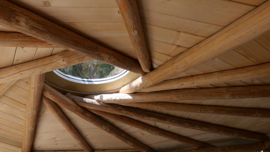 Eine statische Besonderheit und eine unserer Spezialitäten ist die reziproke Dachkonstruktion aus Naturstämmen. Diese Ständerwerk überträgt die Dachlast senkrecht auf die Wände und bietet mit einem zentralen Atrium Raum für eine Lichtkuppel, einen Kamin oder einen Rauchabzug für eine Feuerschale. So entsteht eine einzigartige und holzsparende Grundkonstruktion.