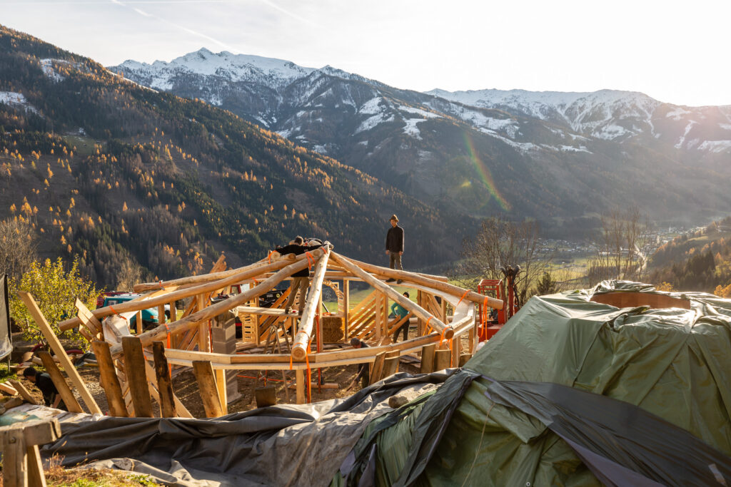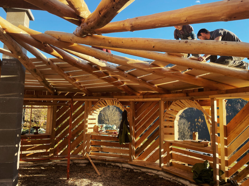 In der ersten Bauphase, werden auf dem Fundament das Holzständerwerk und der Dachstuhl aus runden Baumstämmen errichtet und bis zum Gründach gedeckt. Unter dem fertigen schützenden Dach auf 9 Säulen, lassen sich dann die Lehmwände ganz entspannt und weitgehend frei von Witterungseinflüssen gestalten.