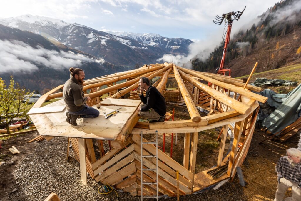 Bestimmte Bauabschnitte eignen sich hervorragend, um externe Teilnehmer einzuladen – etwa der Lehmputz oder der Aufbau des Tragwerks mit dem reziproken Dach.