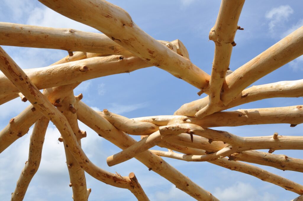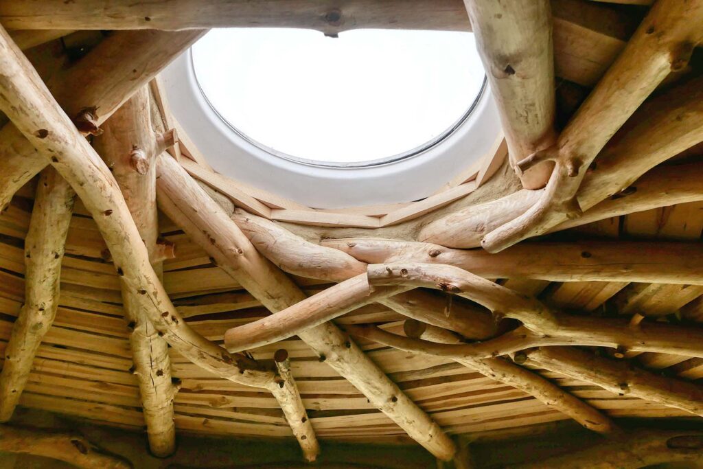 das reziproke Dach aus Kiefer Naturstämmen, in all ihrer Schönheit, so wie die Bäume gewachsen sind