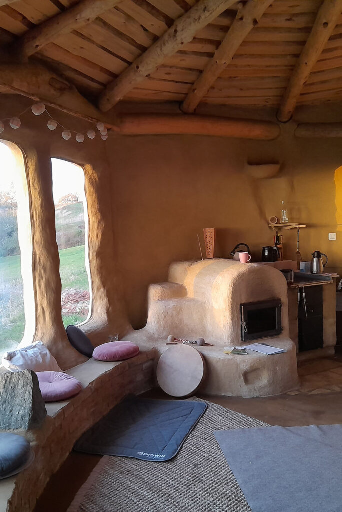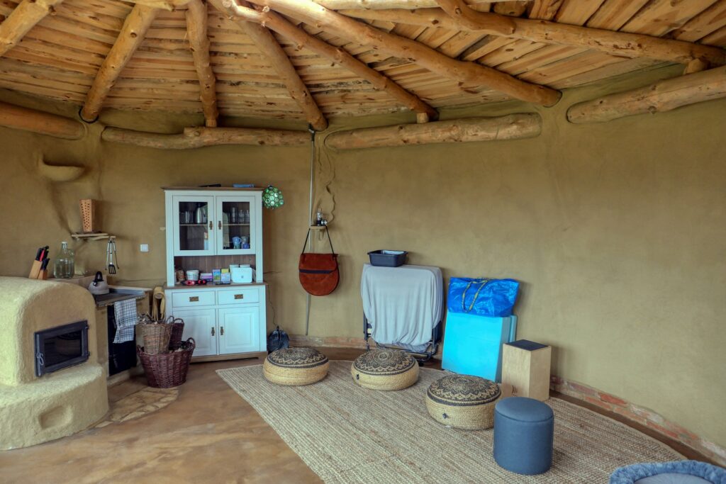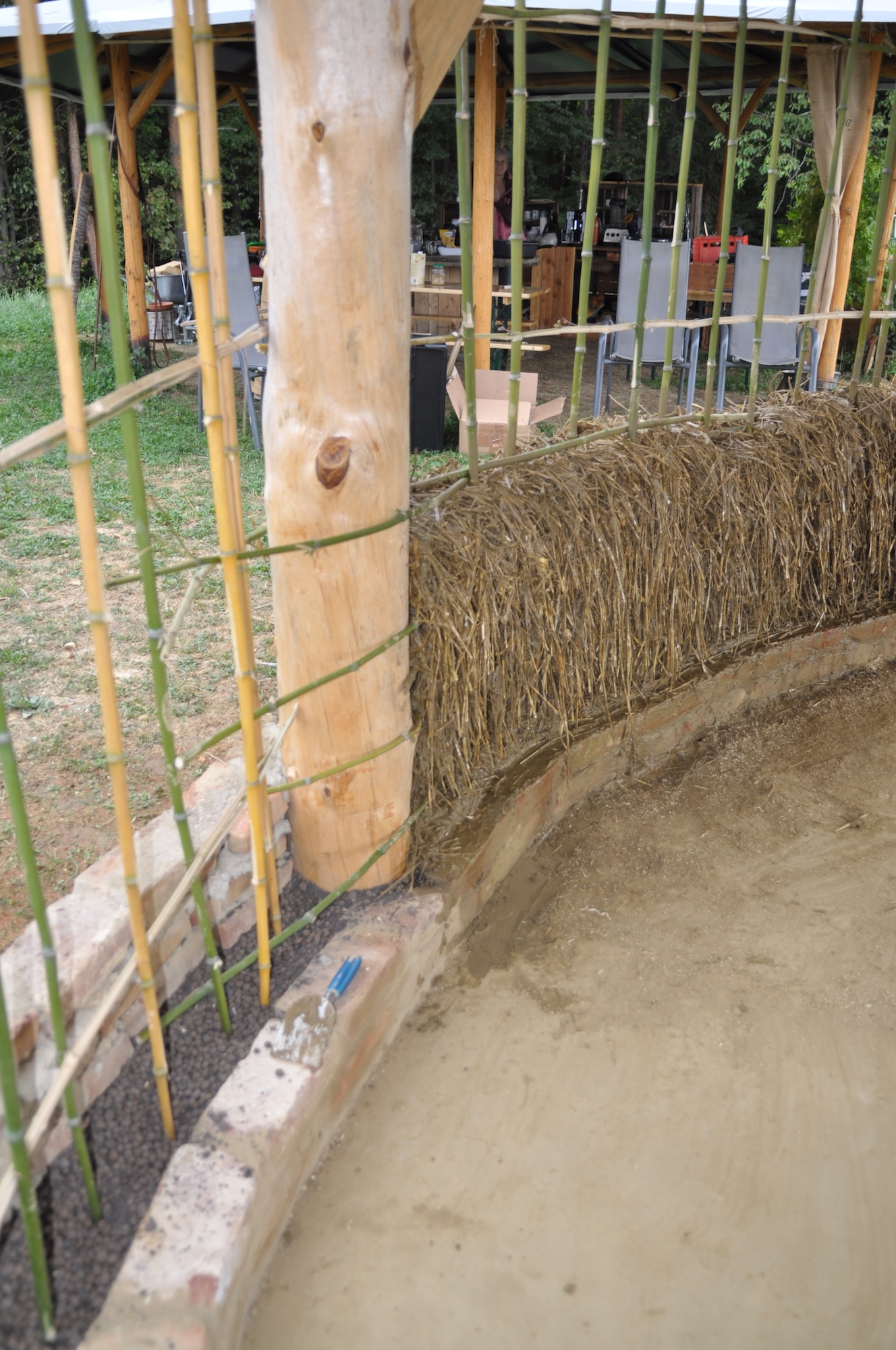 Die Wände sind aus Stroh-Leichtlehm, eingeflochten in ein Bambusgeflecht und innen wie außen mit Lehm verputzt.