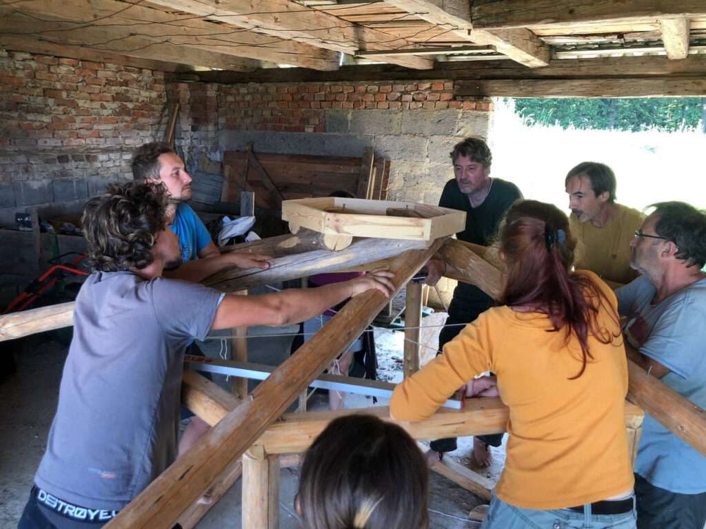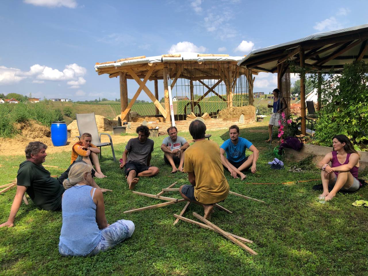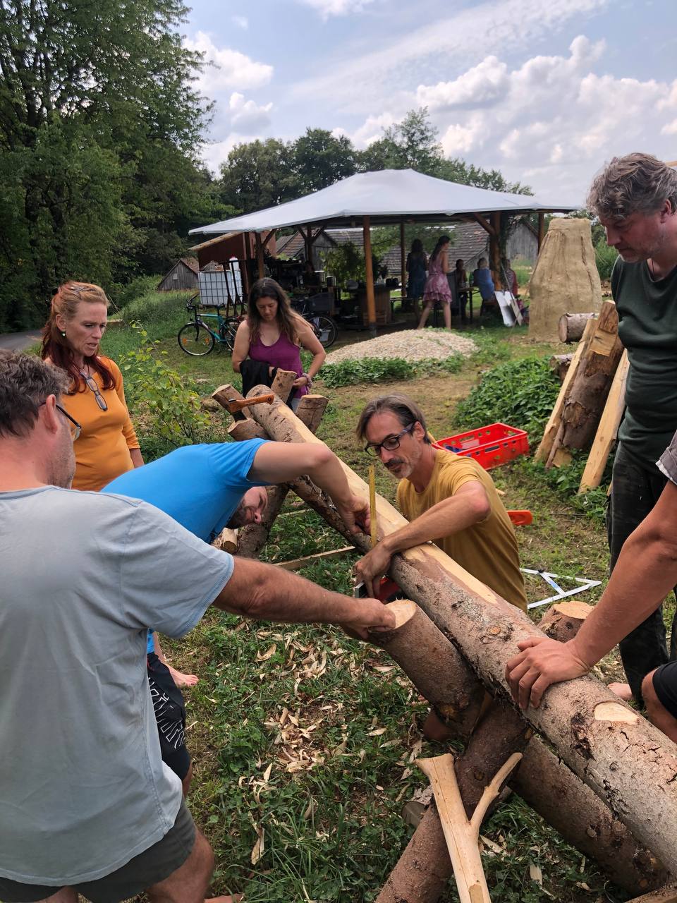 Bearbeitung von Rundholz, Aufbau eines reziproken Daches, Herstellung von Leichtlehmwänden, Lehmputz und das Aufbereiten des Lehms aus dem eigenen Aushub.