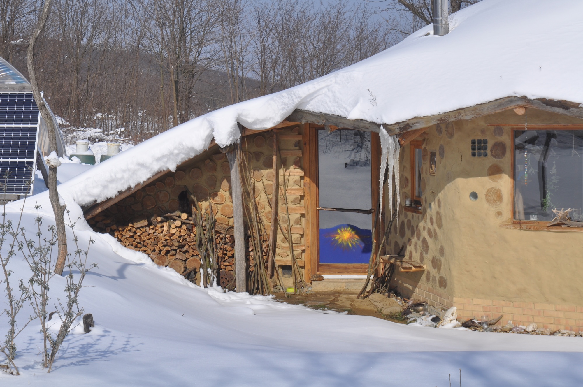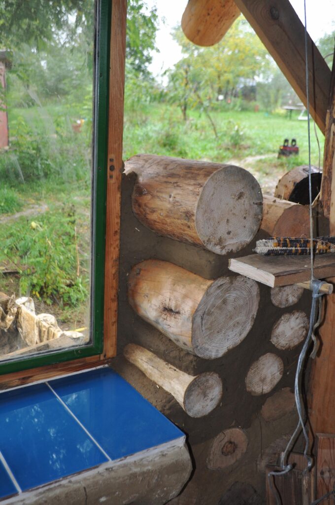 Die Wände bestehen im vorderen Bereich aus Cordwood und im hinteren aus Strohballen, verputzt mit Lehm vom eigenen Grundstück.
