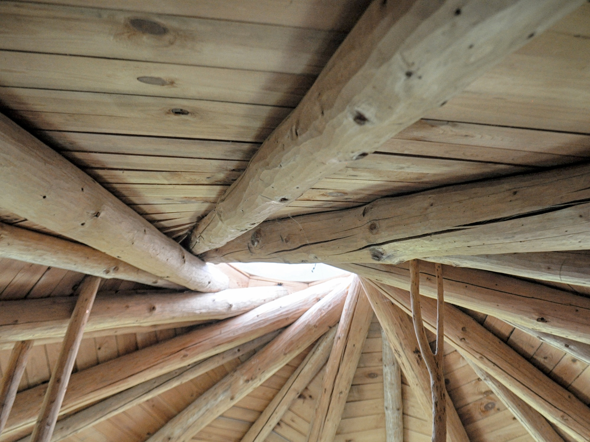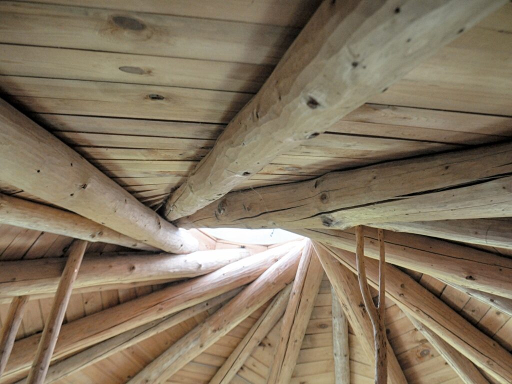 Der Hauptraum misst rund 35 m² und wird von einem reziproken Dach aus Naturstämmen überspannt.